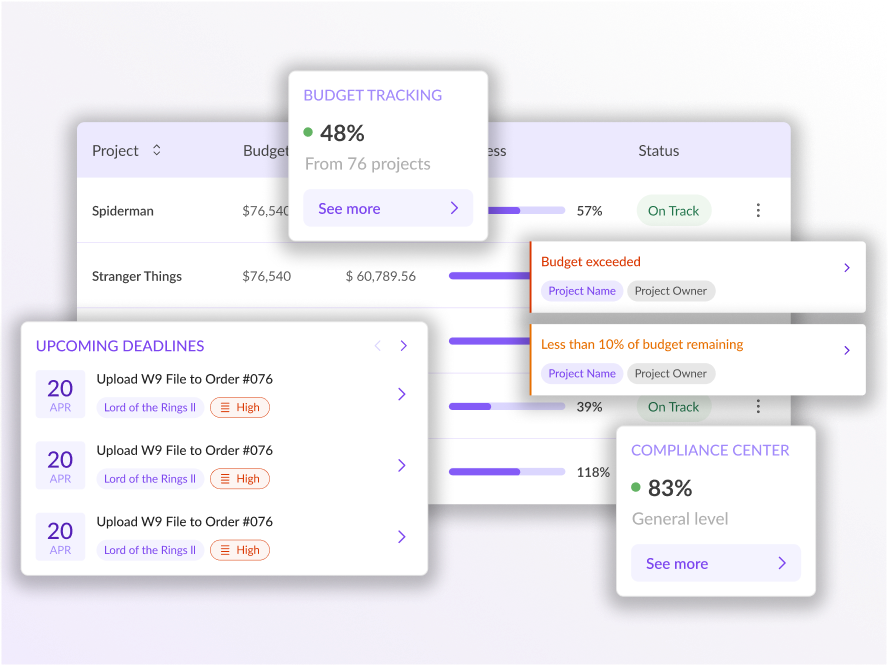 - Compare budgets, burn, and risk across productions